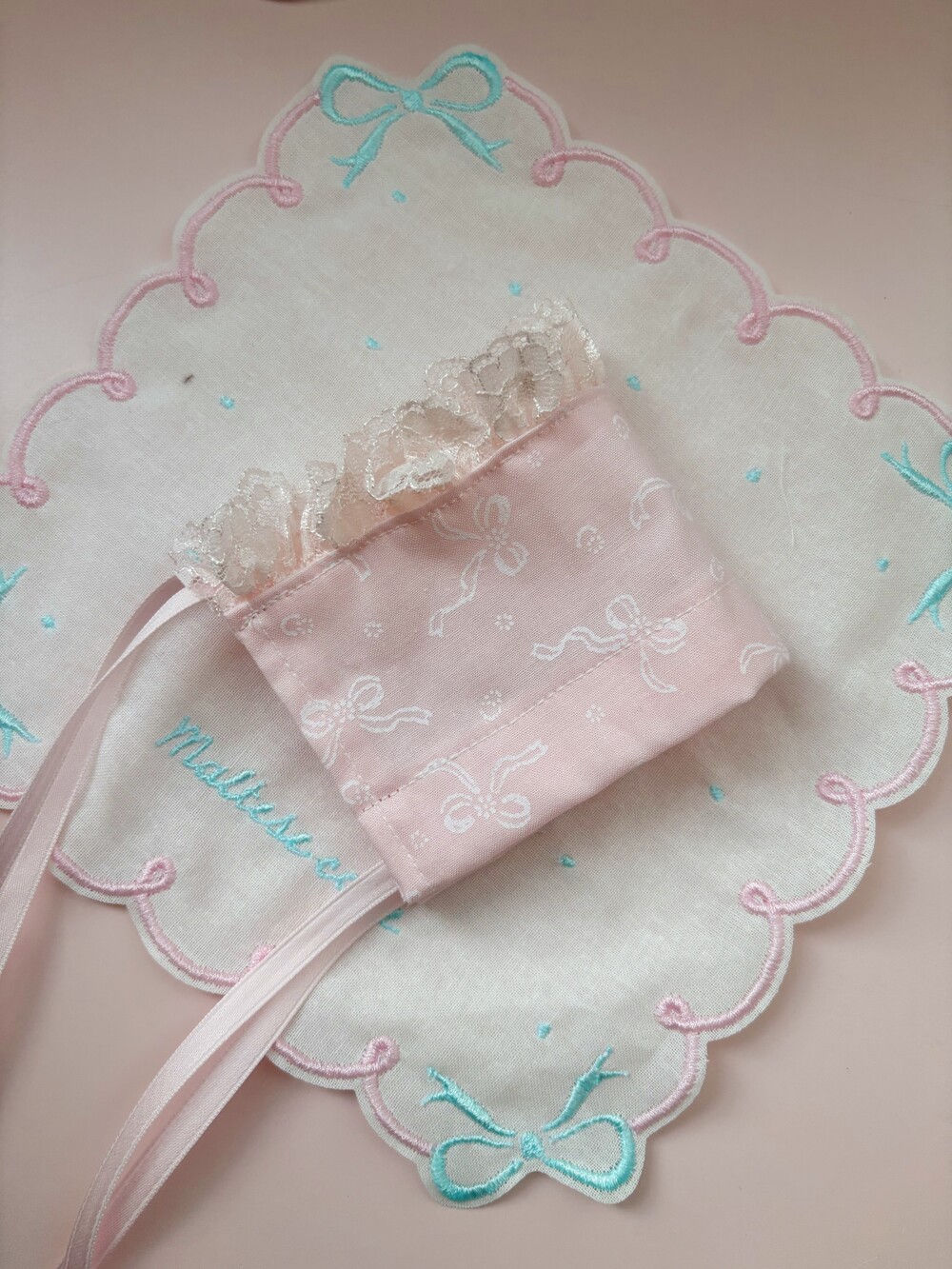 빈티지 핑크 리본 원단과 빈티지한 색감의 핑크 레이스,